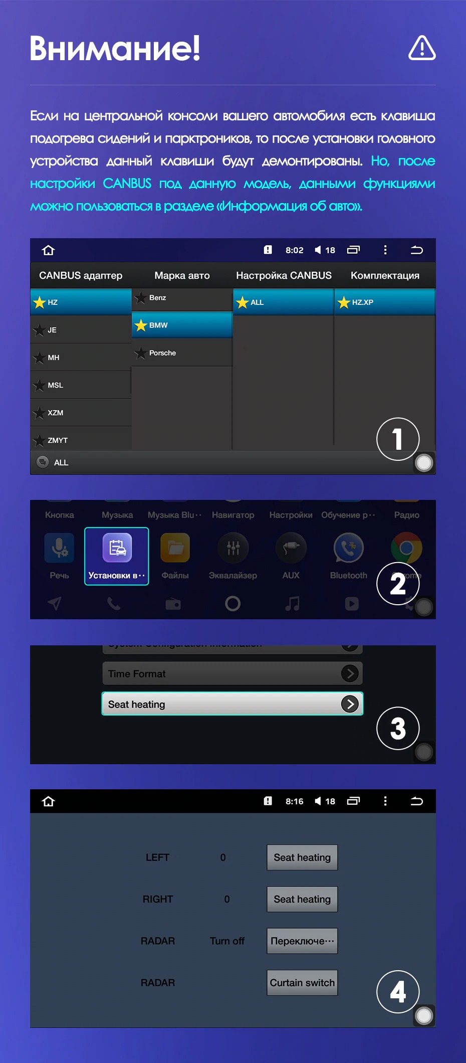 | USB | 3×USB 2.0 + USB 3.0 | Доп. аксессуары | Передняя/задняя AHD-камера, DVR-регистратор, TPMS, парковочный OBD, Type-C → HDMI |
