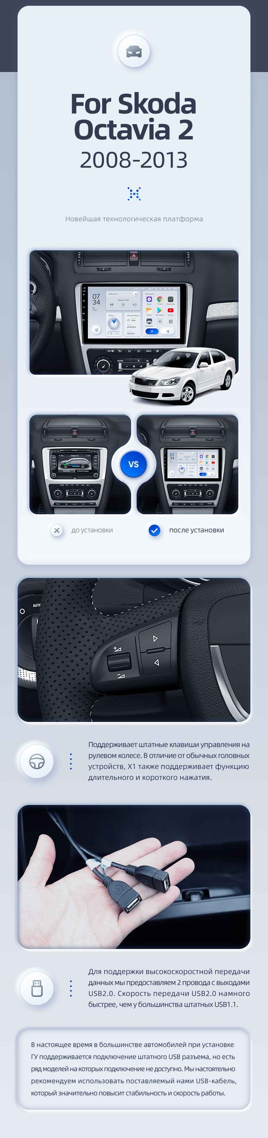 | USB | 3×USB 2.0 + USB 3.0 | Доп. аксессуары | Передняя/задняя AHD-камера, DVR-регистратор, TPMS, парковочный OBD, Type-C → HDMI |