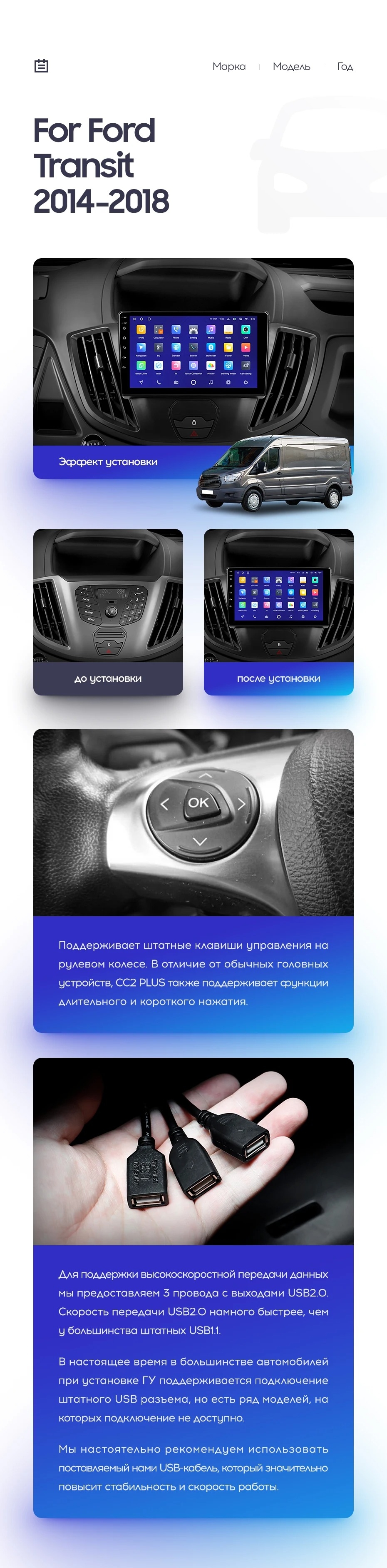 Полный комплект установки магнитолы Teyes с рамкой и проводкой можно выбрать в каталоге штатных магнитол Ford Transit Van L3H2 (2014-2018).