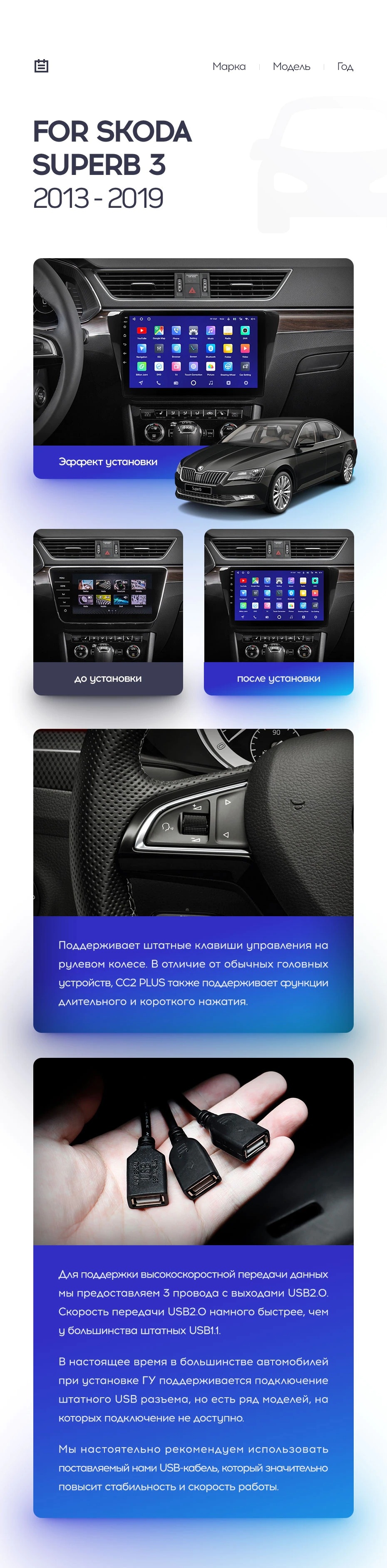 Установочный комплект для Skoda Superb 3 (2015-2026) включает переходную рамку и проводку.