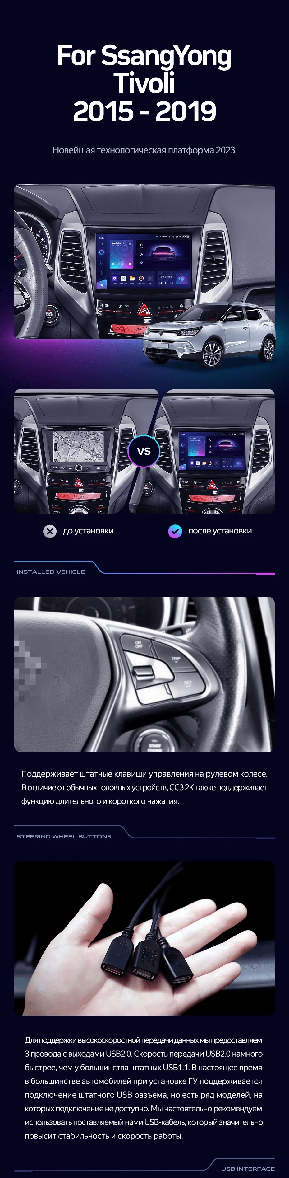 Полный комплект установки магнитолы Teyes с рамкой и проводкой можно выбрать в каталоге штатных магнитол SsangYong Tivoli 2015-2019.