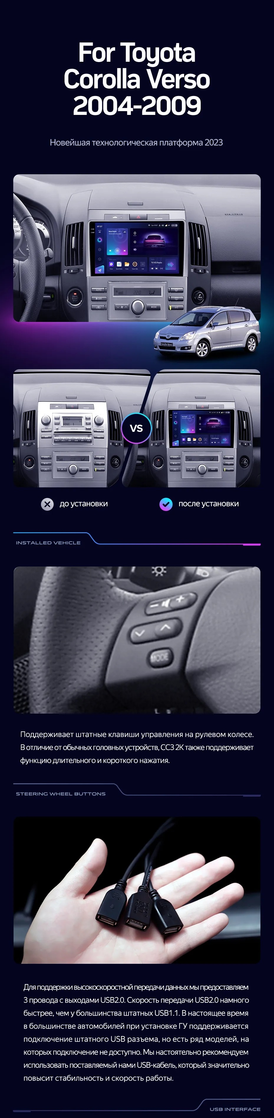Полный комплект установки магнитолы Teyes с рамкой и проводкой можно выбрать в каталоге штатных магнитол Toyota Corolla Verso AR10 (2004-2009).