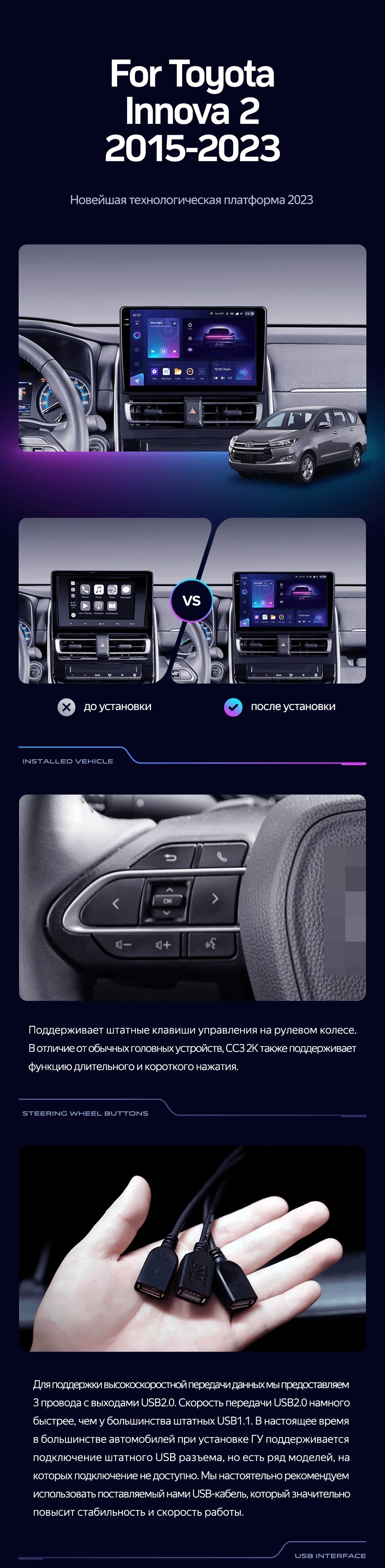 Полный комплект установки магнитолы Teyes с рамкой и проводкой можно выбрать в каталоге штатных магнитол Toyota Innova 2 (2015-2023).